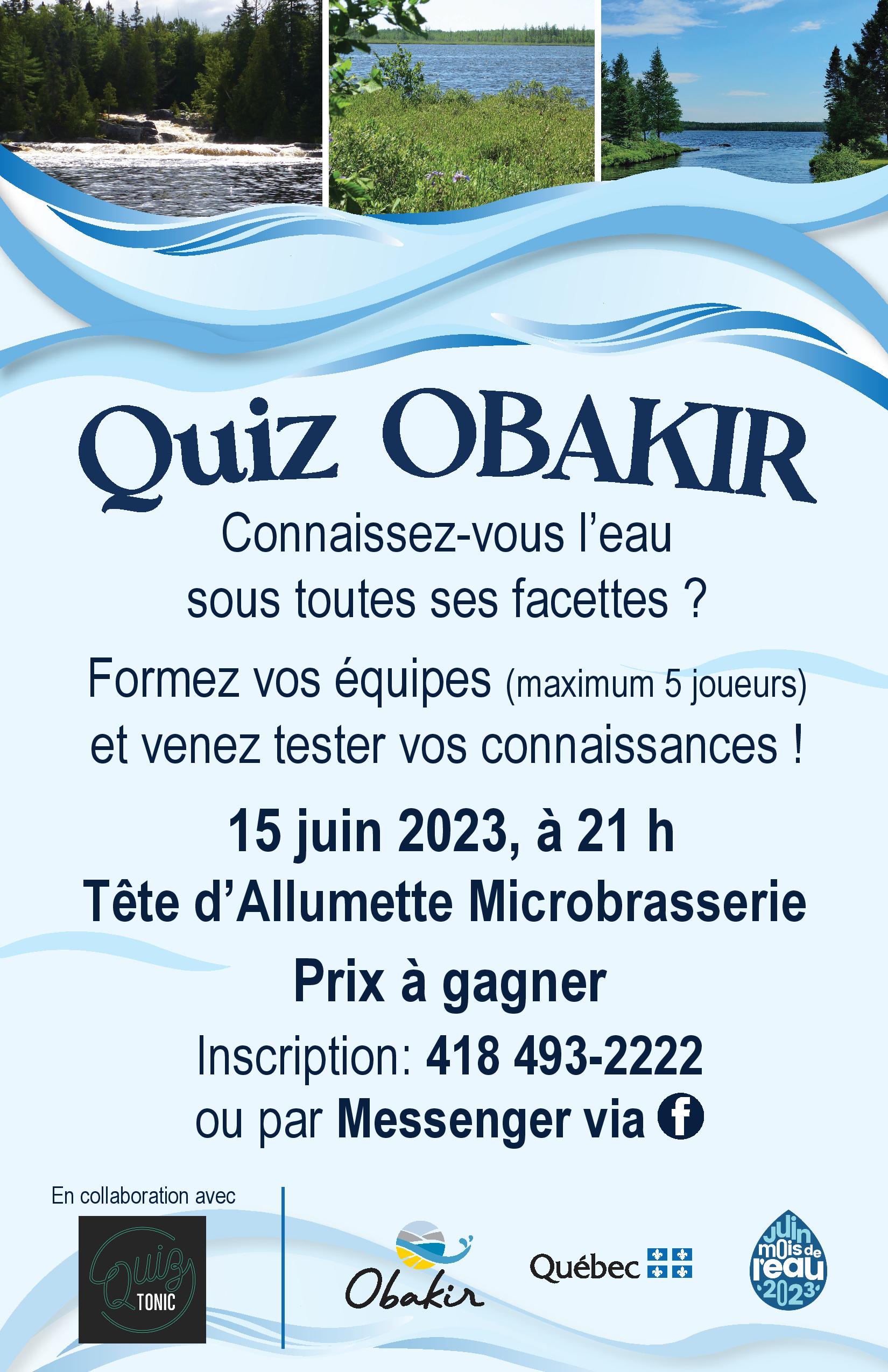 Une soirée Quiz OBAKIR dans le cadre du mois de l'eau ! L'équipe de Quiz Tonic sera à la Tête d'Allumette Microbrasserie pour animer cette soirée. Formez vos équipes (max. 5 personnes) et venez tester vos connaissances !